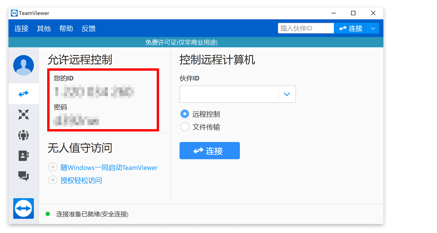 注:TeamViewer 中远程控制 ID 是固定的,但每次打开 TeamViewer 客户端,密码都会变化。没有密码任何人都无法对您的电脑进行控制,所以您无需担心安全问题。